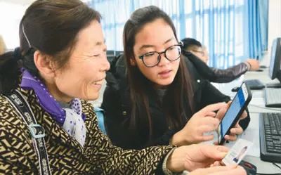 江蘇省鎮(zhèn)江市潤(rùn)州區(qū)七里甸社區(qū)聯(lián)合江蘇科技大學(xué)成立老年網(wǎng)校,幫助老人們快樂(lè)上網(wǎng),豐富文化生活。下圖為志愿者向老年居民傳授智能手機(jī)上網(wǎng)購(gòu)票技能。