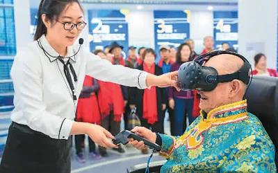 重陽(yáng)節(jié)前后,內(nèi)蒙古呼和浩特市玉泉區(qū)邀請(qǐng)轄區(qū)老年人走進(jìn)該區(qū)新投入運(yùn)營(yíng)的大數(shù)據(jù)應(yīng)用產(chǎn)業(yè)基地,近距離感受新科技帶來(lái)的生活和工作方式的變化。下圖為一位老人在體驗(yàn)VR眼鏡。